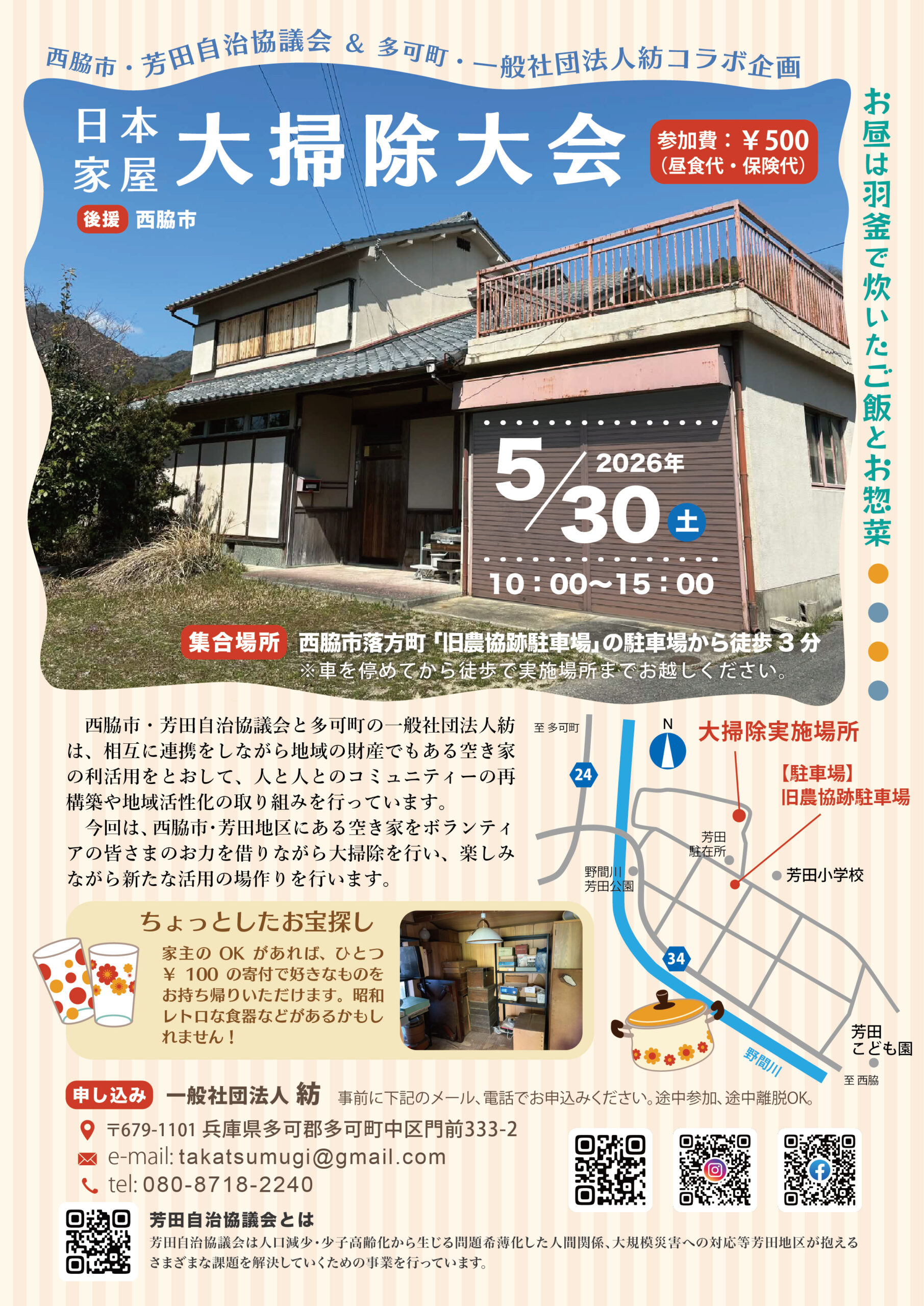 これまで、多可町内の古民家等で実施してきた大掃除大会ですが、空き家の利活用などについて連携して取り組みを行っている西脇市・芳田自治協議会の皆さまとのコラボ企画として、西脇市・芳田地区にある日本家屋の大掃除大会を開催することになりました!